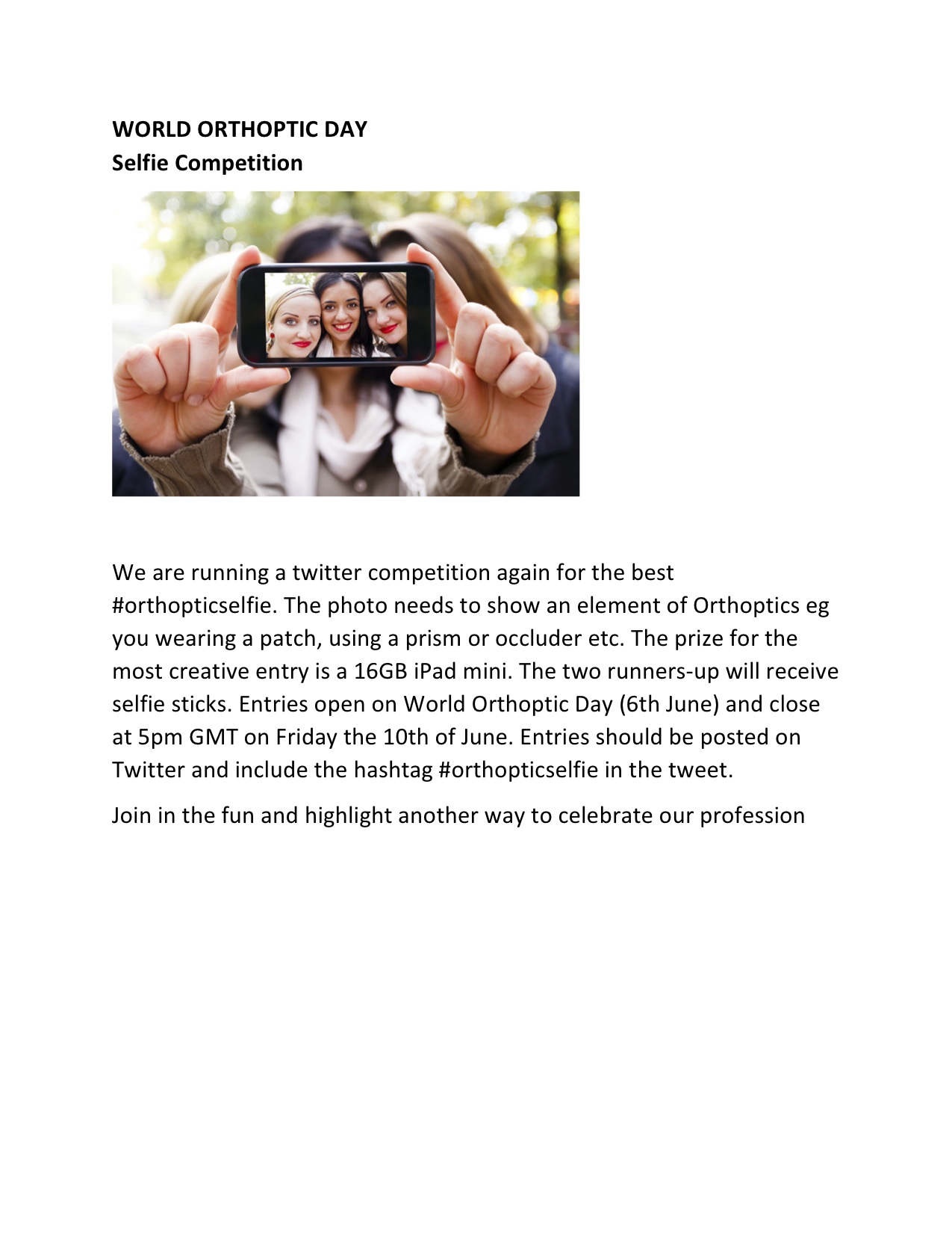 La Journée Mondiale Orthoptique organise un concours de selfies. Pour y participer, veuillez vous référer au règlement du concours ci-dessous (en anglais) :